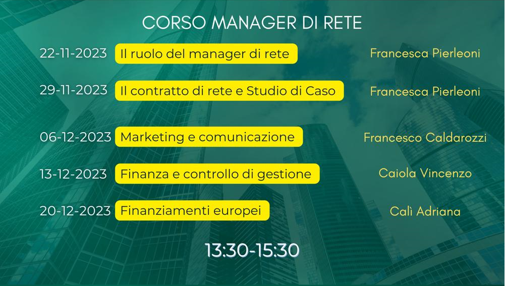 Il Manager di Rete, oltre alla pianificazione, progettazione e controllo di un contratto di rete, deve avere delle spiccate capacità di organizzazione aziendale, di marketing, di gestione finanziaria e amministrativa, conoscendo tutti gli aspetti legali di riferimento.